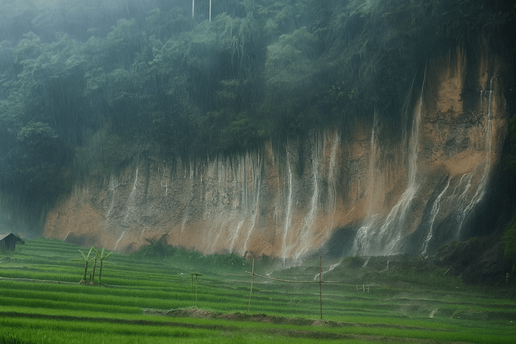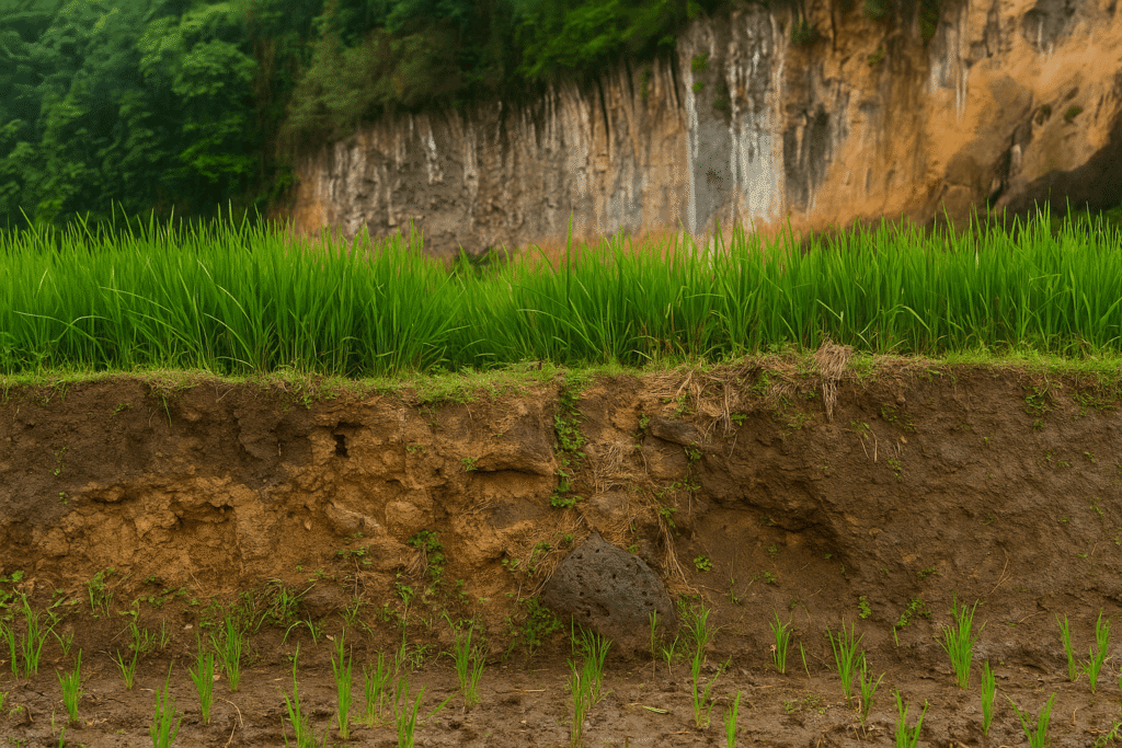 Geomorfologi kawasan merekam rantai lereng dari puncak hingga kaki bukit yang terhubung dengan amfiteater teras sawah. Saat musim hujan, aliran permukaan membentuk rill halus dan kipas sedimen tipis, sementara pada musim kering jejaknya tertinggal sebagai relief mikro. Di kaki tebing, endapan colluvium menumpuk sebagai catatan jatuhan kecil yang berulang. Interaksi batuan, kemiringan, dan sistem irigasi menghadirkan lanskap agraris yang stabil, informatif, serta mudah dipahami pengunjung.