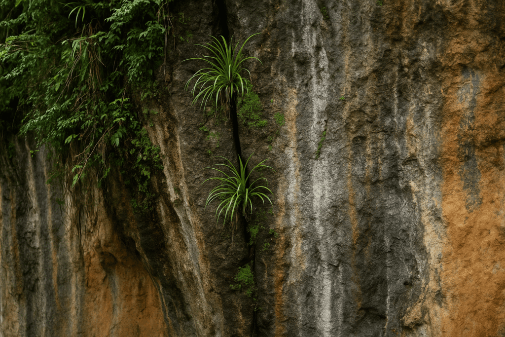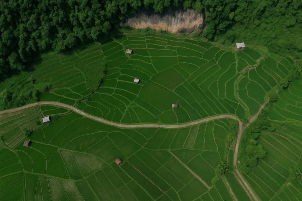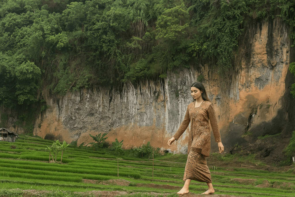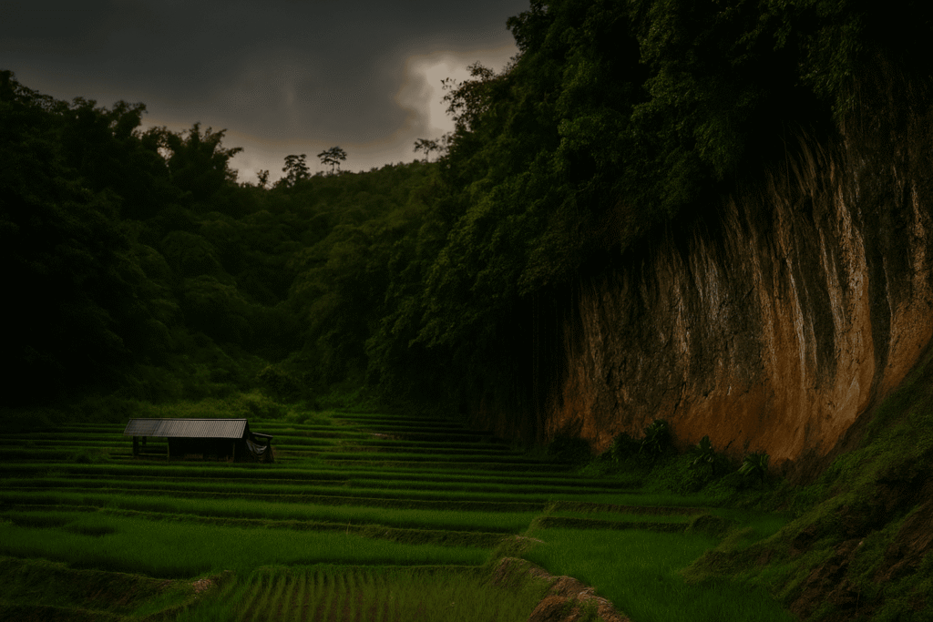 Ketika cahaya miring menyentuh dinding, relief tebing menampakkan plastisitas: rekahan bidang, takik halus, serta gradasi warna oker, abu, dan hitam yang menegaskan arah aliran air. Titik pandang rendah, menengah, dan tinggi pada azimut serupa membantu menguji paralaks sekaligus menjaga integritas horizon. Lapisan kedalaman tersusun alami, dari bund di bagian depan, mosaik teras di tengah, hingga tebing sebagai fokus akhir. Dengan demikian, skala lanskap dapat terbaca jelas dan stabil oleh setiap pengunjung.
