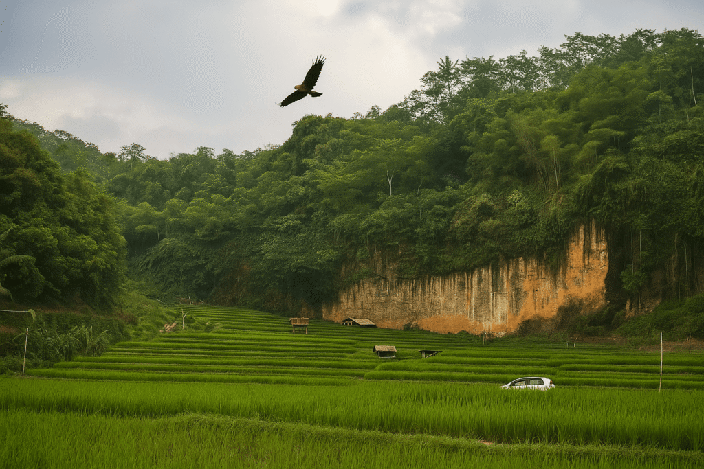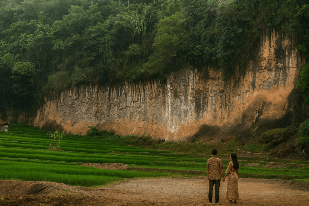 Cadas Gantung adalah landmark visual Bandung sekaligus Jawa Barat. Massa batunya menjulang, garis langitnya tegas, dan amfiteater teras sawah membingkai komposisi khas yang sukar ditandingi. Dari jalur pematang, koridor pandang menuntun mata ke Tebing Barat yang menyingkap jalur rembesan, oksidasi berwarna oker hitam, serta jejak micro talus. Saat sore menjelang, cahaya hangat menegaskan relief alami hingga lanskap tampil laksana kartu pos ikonik yang mudah dikenali serta melekat dalam ingatan kolektif wisatawan.