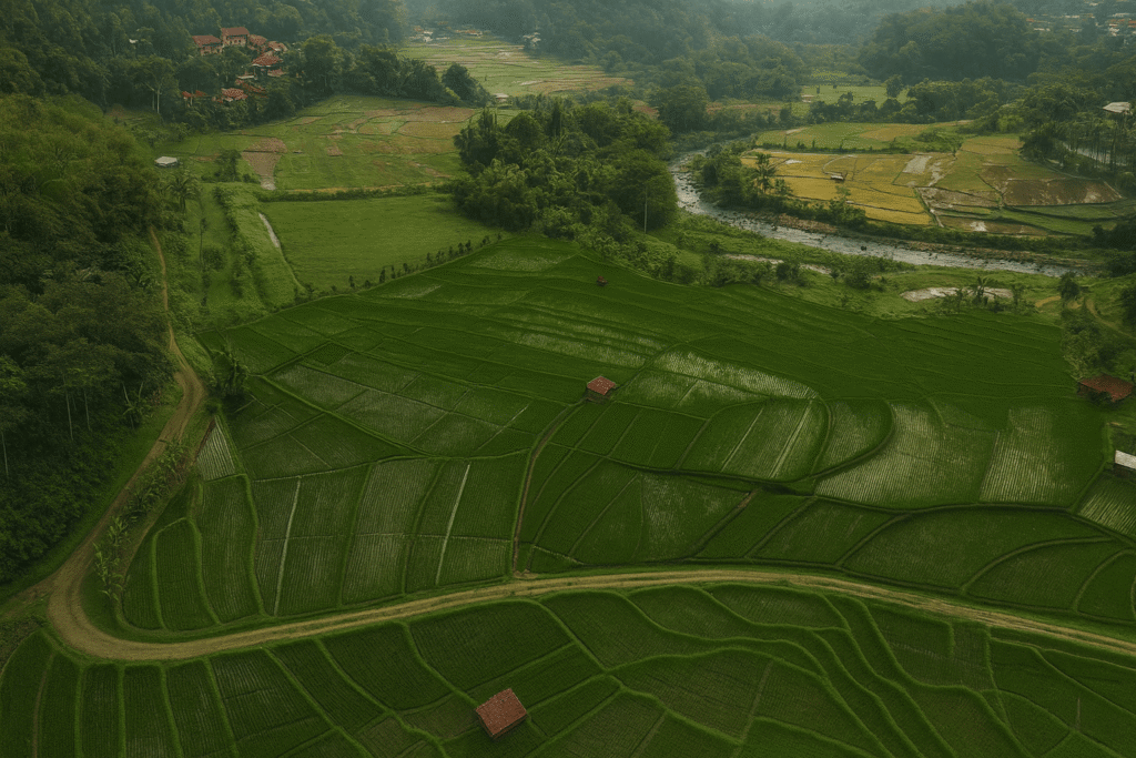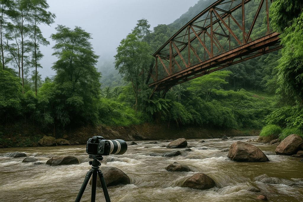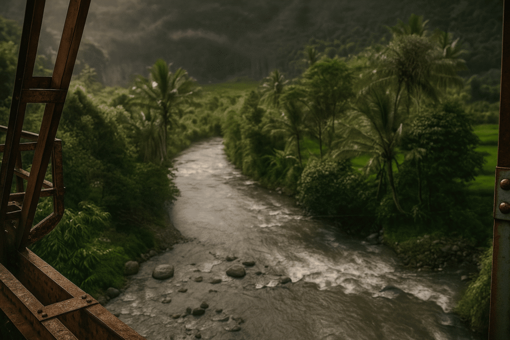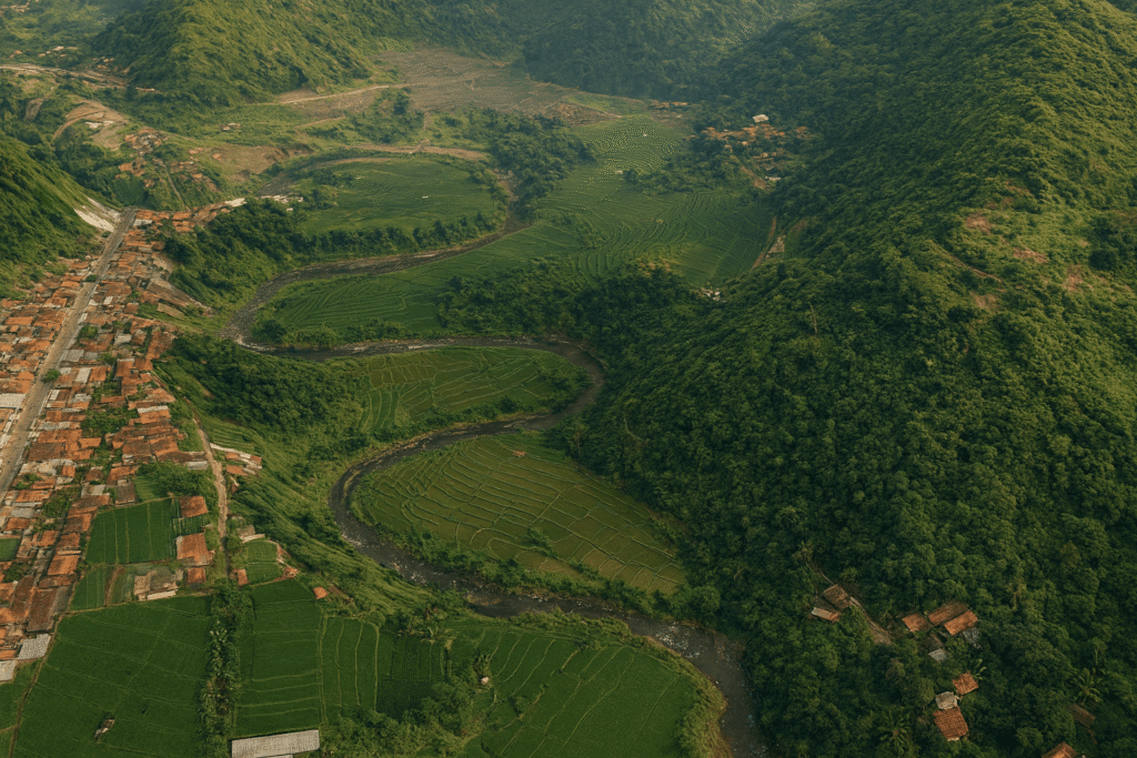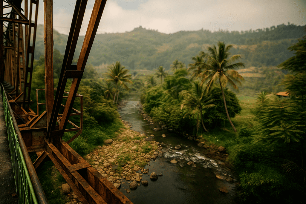 Aliran sungai Cadas Gantung menjadi pengikat alami antara tebing, sawah bertingkat, dan perkampungan. Kelokannya menuntun pandang dari hulu ke hilir, memperlihatkan ritme vegetasi riparian, batu vulkanik, serta perubahan warna air sepanjang musim. Pagi menghadirkan cahaya lembut menonjolkan tekstur galengan. Menjelang sore, sinar hangat memantul di permukaan air dan menegaskan siluet rangka baja di kejauhan. Lanskap ini menjadi bingkai baca yang jelas untuk memahami hubungan geologi, pertanian, dan karya rekayasa manusia.