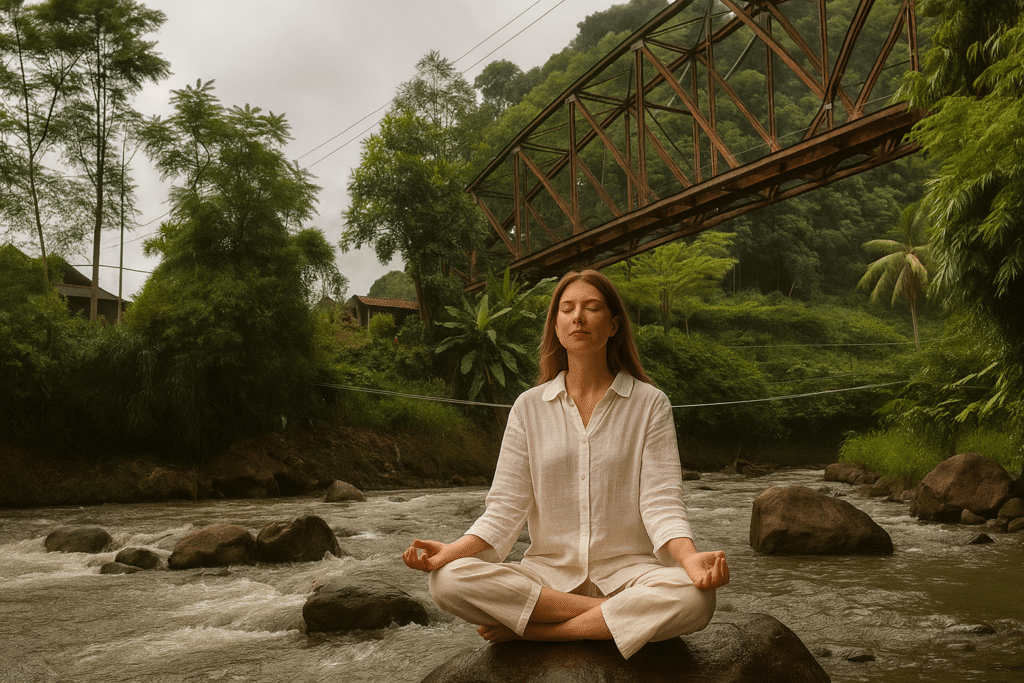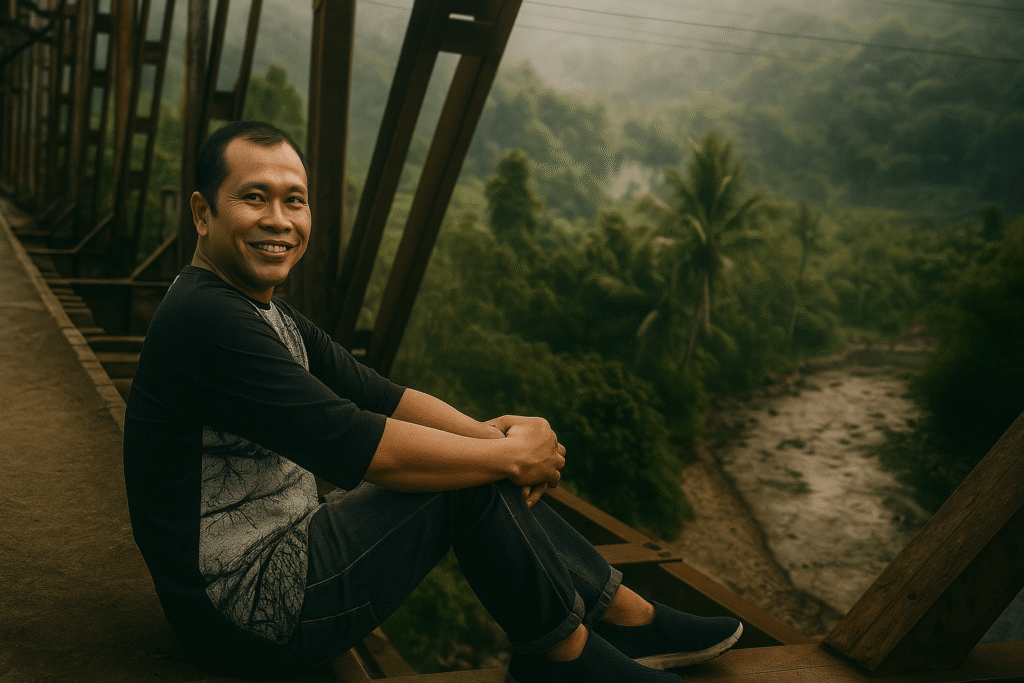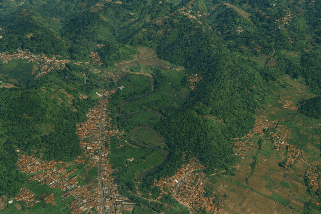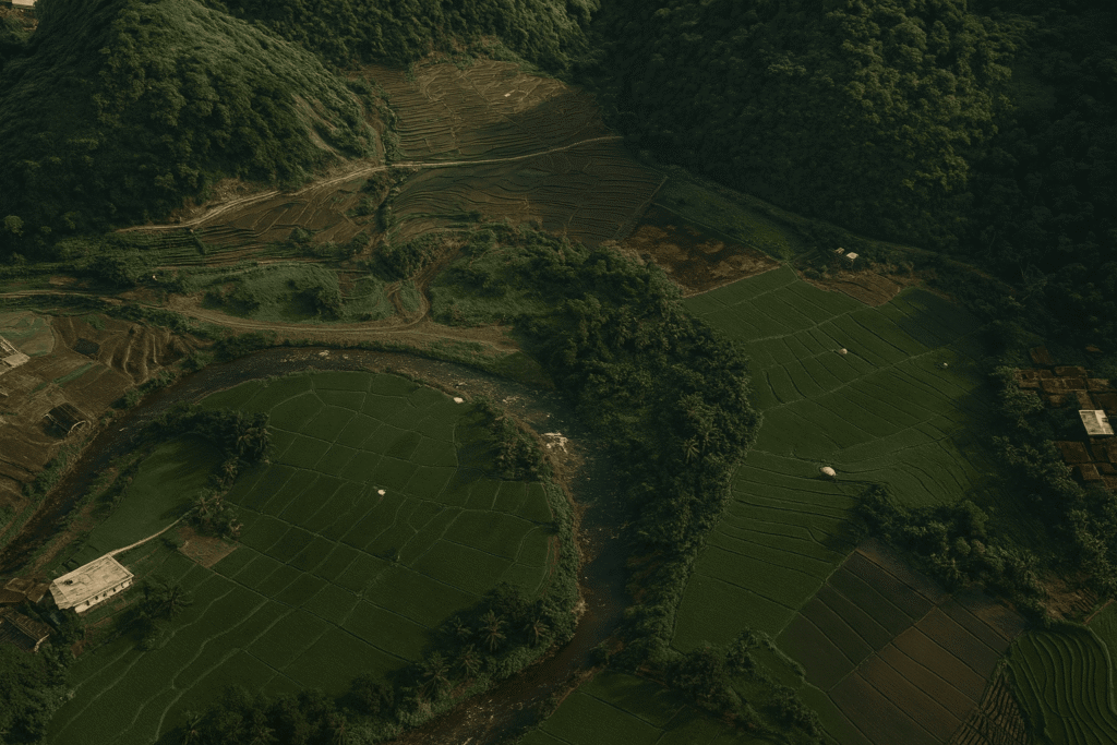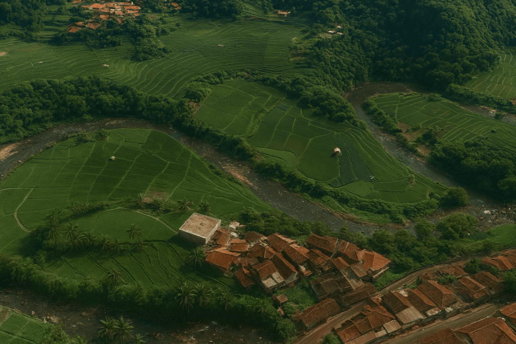 Aliran sungai Cadas Gantung menjadi pengikat alami antara tebing, sawah bertingkat, dan perkampungan. Kelokannya menuntun pandang dari hulu ke hilir, memperlihatkan ritme vegetasi riparian, batu vulkanik, serta perubahan warna air sepanjang musim. Pagi menghadirkan cahaya lembut menonjolkan tekstur galengan. Menjelang sore, sinar hangat memantul di permukaan air dan menegaskan siluet rangka baja di kejauhan. Lanskap ini menjadi bingkai baca yang jelas untuk memahami hubungan geologi, pertanian, dan karya rekayasa manusia.