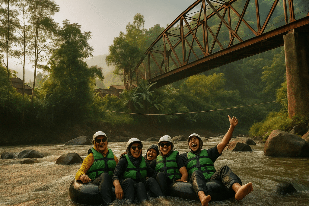 Kegiatan tingkat menengah dikembangkan melalui arung jeram dengan rute 5, 11, dan 18 kilometer bersama operator berizin. Setiap perjalanan diawali dengan pengarahan, penggunaan alat pelindung diri, serta pendampingan pemandu dan tim penyelamat. Layanan shuttle dari garis akhir ke titik mula, asuransi, dan pencatatan debit air harian menjadi bagian dari standar operasional. Zonasi antara area tenang dan aktif menjaga ritme pengalaman agar tidak bertabrakan. Kapasitas setiap segmen dibatasi untuk menjamin keselamatan dan kenyamanan, sementara integrasi kuliner tepi sungai dan titik istirahat kering memperkaya perjalanan wisata yang tertib, aman, dan ramah lingkungan.