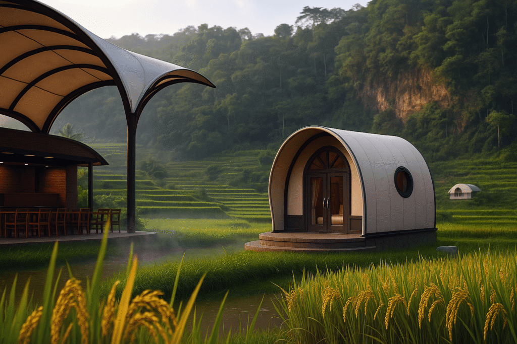 Zona Hospitality – Pasanggrahan Lemah Paré menghadirkan akomodasi ramah lingkungan yang dirancang menyatu dengan lanskap pertanian kawasan Cadas Gantung. Unit tenda ditempatkan pada lahan khusus yang tetap produktif, terletak di tepi pematang dengan orientasi pandang ke arah matahari terbenam. Penataan mengikuti kontur alami untuk menjaga keserasian visual dan ekologis. Privasi setiap unit dijaga melalui penanaman vegetasi peneduh, sementara jalur pejalan kaki dan dek dibangun dengan struktur ringan agar tidak merusak galengan. Ventilasi silang, bukaan terarah, serta pencahayaan malam yang lembut diterapkan untuk menjaga kenyamanan tanpa mengganggu suasana alami kawasan.