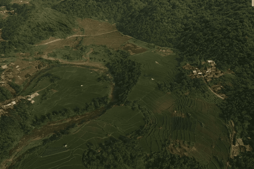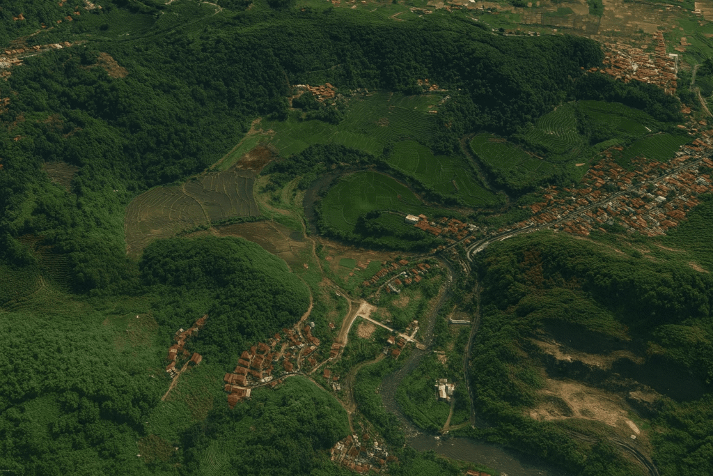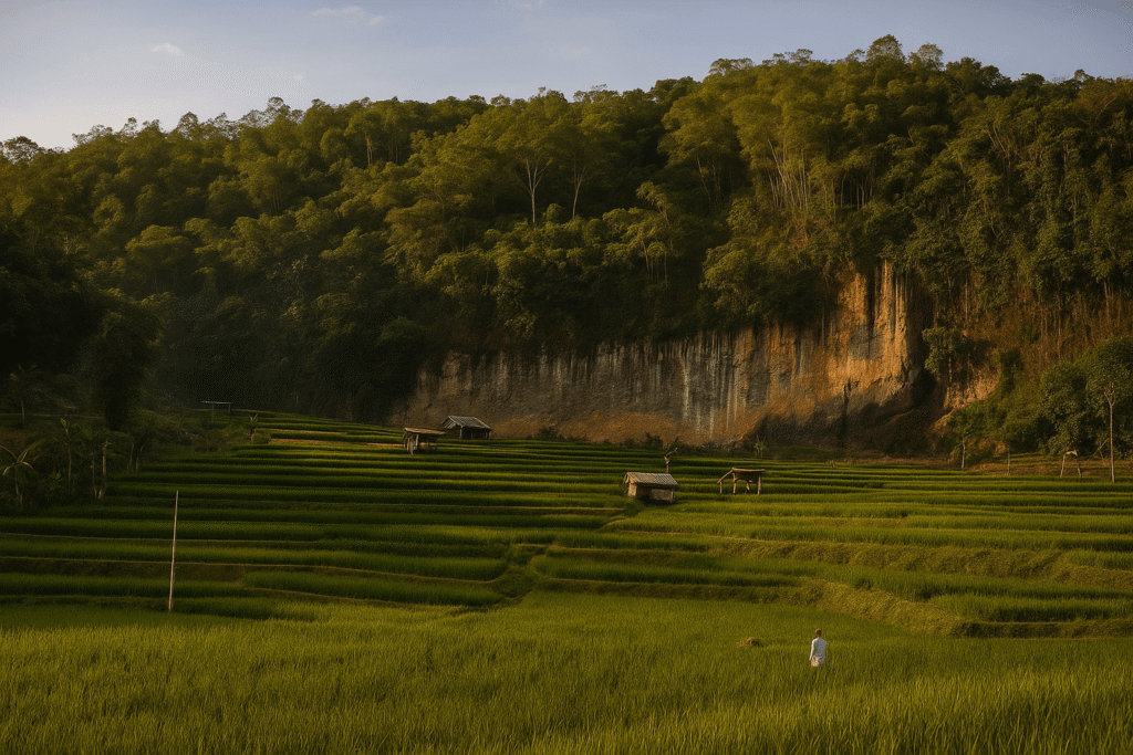 Zona Agraris–Interpretatif menempatkan area sawah dan pematang sebagai ruang belajar terbuka sekaligus jalur wisata yang tertib dan aman. Pematang digunakan sebagai jalur jalan kaki untuk menikmati pola terasering, mengenal ritme tanam, sistem irigasi, dan aktivitas petani tanpa mengganggu proses budidaya. Penataan dilakukan secara ringan, seperti pemasangan penanda arah, alas antiselip di titik licin, serta dek pengamatan berukuran 4×6 meter di lokasi yang aman untuk berhenti dan menikmati pemandangan. Setiap elemen mengikuti kontur alami lahan agar bentuk galengan dan panorama tetap terjaga.